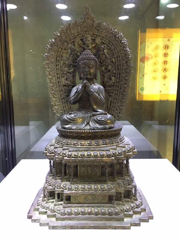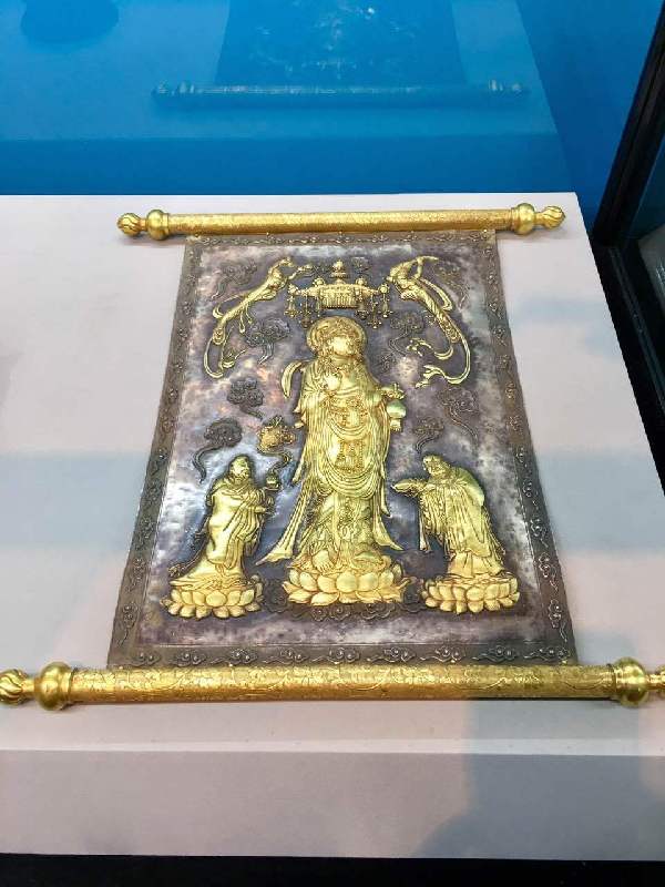 繼上個月舉辦的第一季“民國瓷畫展”,目前正在展覽的是第二季“佛像藝術展”。展出了遼金時期的銀鎏金佛塔、宋代泥塑描金的書卷觀音像、唐代捶揲銀鎏金“佛說金色王經(jīng)”上下卷,還有南北朝時期的石雕彩漆描金思維菩薩像,這一期展出了29件展品。