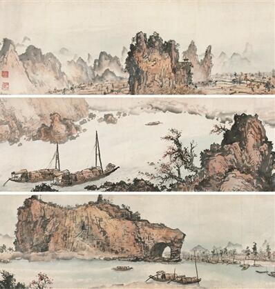 關(guān)山月白天外出寫生,晚上整理寫生畫稿,獲得了一大批寫生作品。秀美的桂林山水激發(fā)了他的創(chuàng)作熱情,引發(fā)了他的創(chuàng)作靈感,他覺得應(yīng)該進(jìn)行大的創(chuàng)作,把百里漓江兩岸勝景盡收畫卷之中。但是,他所住的七星巖公寓,又小又暗,只有一張小桌子,施展不開。而且,他還欠了一大筆租金,住不下去了。幸好得到李焰生的幫助,住進(jìn)其家,得以在李家的客廳里作畫,桌子不夠?qū)?,他就把紙鋪在地板上蹲、趴著畫。奮戰(zhàn)了月余,終于完成了一幅32.8厘米×2850厘米的長(zhǎng)卷《漓江百里圖》,開創(chuàng)了廣西的“漓江畫派”風(fēng)格。