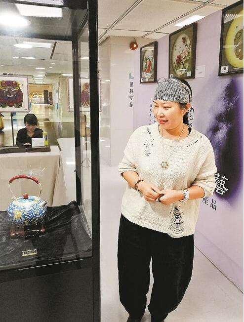 展臺(tái)前的景泰藍(lán)銀器茶壺精致漂亮,典雅高貴,它的制作者山西銀滿樓景泰藍(lán)公司技術(shù)總監(jiān)吳鳳芳在景泰藍(lán)行業(yè)已經(jīng)耕耘36年。她在上世紀(jì)90年代成功將傳統(tǒng)的銅胎掐絲景泰藍(lán)革新品種,研制成功銀胎掐絲琺瑯,并于2012年獲得的國(guó)家技術(shù)發(fā)明專利。