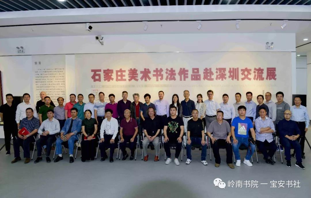 石家莊市與深圳市美術(shù)書(shū)法界的藝術(shù)家與參加開(kāi)幕式的領(lǐng)導(dǎo)和嘉賓合影,石家莊美術(shù)書(shū)法作品赴深圳交流展成功開(kāi)幕。