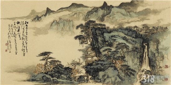 范陽(yáng)先生的山水畫(huà),筆法近取傅抱石、黃秋園,遠(yuǎn)溯“元四家”中黃公望、王蒙。筑居楊岐山下,使先生日夜親近自然山水,吐納天地,養(yǎng)浩然之氣?!巴鈳熢旎械眯脑础?,唐代張璪一言道破了山水畫(huà)家修養(yǎng)、悟性的不二法門(mén)。范陽(yáng)先生正是以自然(造化)為營(yíng)養(yǎng),入而為心靈化育,镕冶成亦古亦新,遠(yuǎn)離塵俗的獨(dú)特風(fēng)格。近作《松風(fēng)泉聲》(五屏聯(lián))氣勢(shì)磅礴,大開(kāi)大合,細(xì)究又十分謹(jǐn)嚴(yán)。筆墨與丘壑融為一體,既豪放又穩(wěn)健。淺絳青綠的設(shè)色,使畫(huà)面有蔥翠欲滴之感??胺Q(chēng)山水畫(huà)中的經(jīng)典。