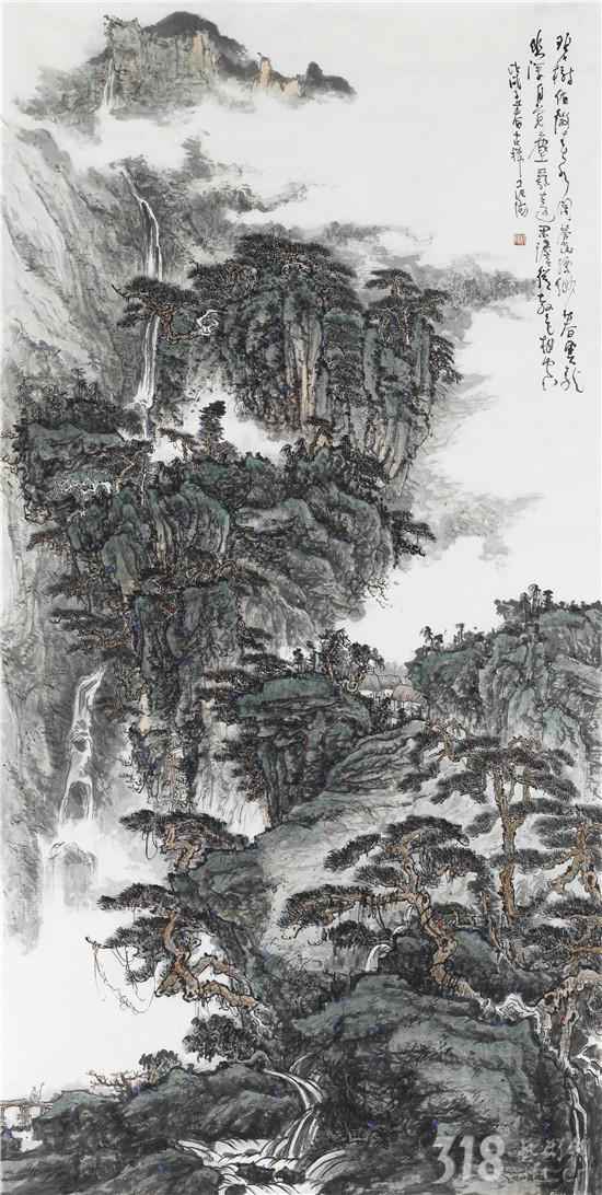我以為,范陽(yáng)先生是真正在心性上貼近古人“不下堂筵,坐窮泉壑”,其現(xiàn)居贛中名岳武功山、楊岐山之中。尤其武功山,史上與衡山、廬山并稱(chēng)江南三大名山,被冠以“衡首廬尾武功中”,山脈綿延浩瀚,茫茫無(wú)際。范陽(yáng)先生終日面山臨壑,弄筆自適,得武功真容。山水畫(huà)從來(lái)就不是簡(jiǎn)單的描摹自然的風(fēng)光,無(wú)論丘園養(yǎng)素還是泉石嘯傲,都是畫(huà)者精神的自然流露,這是畫(huà)家筆墨情態(tài)的表達(dá),亦是畫(huà)家藝術(shù)境界追求的體現(xiàn)。對(duì)于山林的描繪,承載了畫(huà)者對(duì)泉石意趣的向往,對(duì)于林下境界的追求。范陽(yáng)先生的山水畫(huà)作品長(zhǎng)于布景,對(duì)山中的“陰、晴、朝、夕”的細(xì)膩描繪都有他自已獨(dú)特感悟和表達(dá)。筆下極丘壑浩渺之勢(shì),奇峰羅列,宛有風(fēng)骨,深壑幽谷,其勢(shì)超峻;至于松柏掩映,峭壁涌泉,野道幽麓,于野逸之態(tài)甚備。范陽(yáng)先生數(shù)十年來(lái)遍臨南北宗諸家,遠(yuǎn)溯元人四家,清初四王,近至黃秋園,上下求索,崇穆有加,最終歸皈真逸正脈。新近年逾七十之作,日漸精熟,蒼腴古厚,更趨融古化古之態(tài),細(xì)究其筆下蹤跡:子久?麓臺(tái)?秋園?各不相肖,而莫不精備。諦觀其中景象:匡廬?武功?羅霄?渾然而化,不一而足。如此境地當(dāng)稱(chēng)“妙解”。