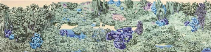 扈海風的繪畫,呈現(xiàn)出一種介于中國水墨與西方架上藝術(shù)之間的視覺效果,具有中國水墨的時空韻腳。扈海風用近乎絲網(wǎng)印刷的平涂手法,對幾個具有中國元素的形象符號展開審視。那些原本存在于古典語境中的符號經(jīng)歷復制、重疊等過程而被重塑,還原成山水或風景,成為藝術(shù)家筆下的“中國花園”。