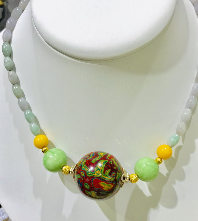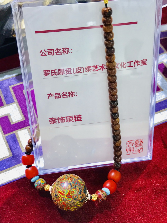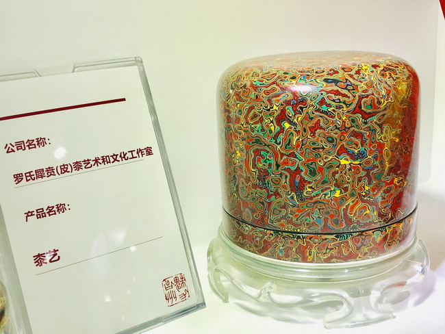 浙江省組團(tuán)的展位在會展中心2號館,規(guī)模不小,羅獻(xiàn)兵老師的漆藝作品都比較精致,但展位卻比較舒展。一眼望去,五彩斑斕的漆藝作品令人眼花繚亂,精神為之一震,主要作品有犀皮漆扇、印盒、糖果盒、竹胎茶杯、腰墜以及手串和漆珠等。前來參觀的人不少,但從他們的言談中得知了解的并不多,多為其絢麗的光彩所吸引。