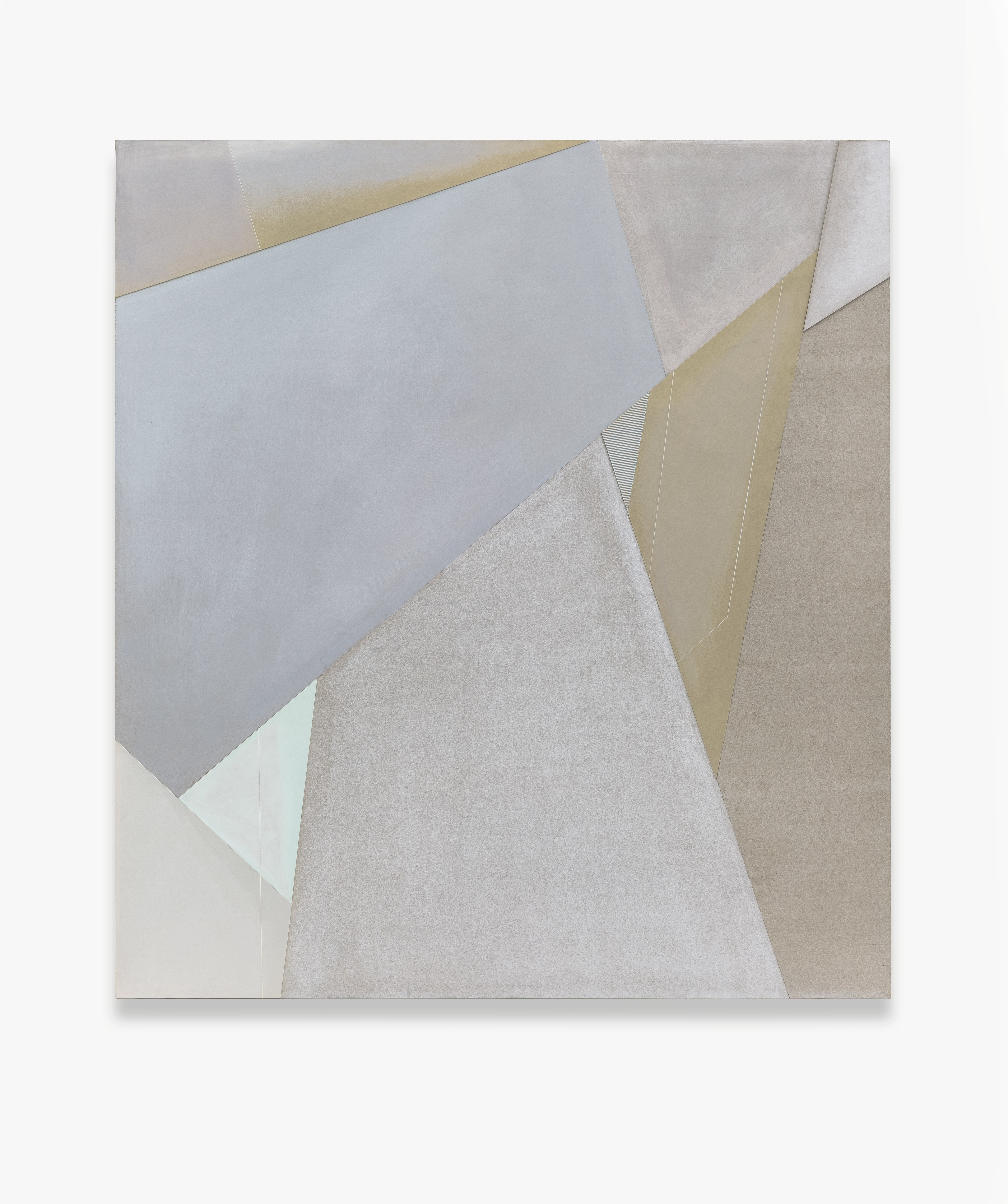 自2013年王豪開始以水泥作為個人創(chuàng)作媒介以來,三個系列“寂”、“樸”、“遠”并行展開?!凹拧焙汀皹恪睆娬{(diào)水泥作品的靜態(tài)特征,不論是單件作品還是多件組合作品,在水泥材料的細(xì)微變化與色塊搭配上,力求傳達出一種寧靜、樸拙的整體氣息;“樸”系列在形式上更為豐富,不僅嘗試使用斜線、三角形乃至圓形,還探索富于中國古典韻味的形式表達(例如對中國古代手卷的模擬);“遠”系列的名稱則來源于中國傳統(tǒng)山水繪畫所特有的透視技法“三遠”概念,這系列作品意圖通過畫面的動態(tài)表現(xiàn)打破二維空間限定,拓展平面繪畫的深度與廣度,從美學(xué)意境上與高遠、深遠、平遠相融合。