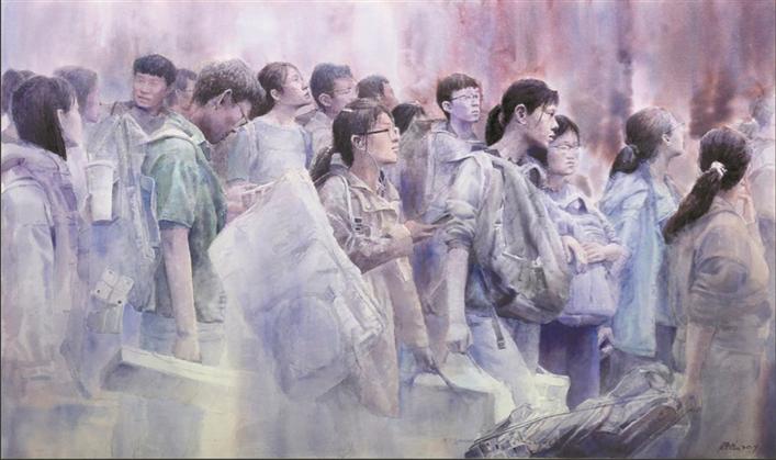 藝術(shù)家方曉龍此次有兩件作品入選,分別是水彩畫(huà)《追夢(mèng)》和與青年藝術(shù)家張凱合作的油畫(huà)《掠過(guò)晨曦的夢(mèng)想》。兩幅作品聚焦同一主題——青年學(xué)子參加藝考,這來(lái)自他對(duì)這一題材長(zhǎng)年累月的觀察。