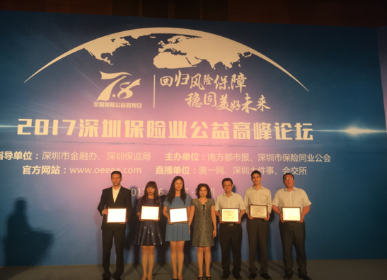 7月6日,由深圳市金融辦、深圳保監(jiān)局指導(dǎo),深圳市保險(xiǎn)同業(yè)公會(huì)和南方都市報(bào)聯(lián)合主辦的“2017深圳保險(xiǎn)業(yè)公益高峰論壇”在深圳五洲賓館召開,太平財(cái)險(xiǎn)深圳分公司榮獲“2017深圳保險(xiǎn)業(yè)精準(zhǔn)扶貧先進(jìn)單位”稱號(hào)。