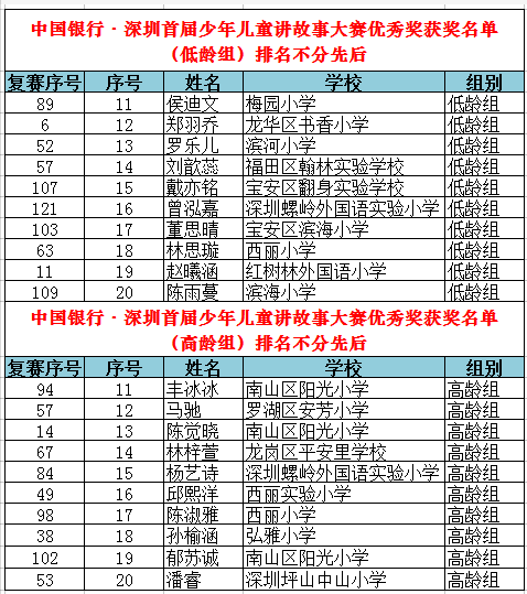 從全市近百所學(xué)校、社會(huì)賽區(qū)報(bào)名的萬余名參賽選手中脫穎而出的選手們齊聚復(fù)賽賽場(chǎng),比賽競(jìng)爭(zhēng)異常激烈。晉級(jí)復(fù)賽的225人(其中高齡組104人,低齡組121人)使出渾身解數(shù),講述著自己喜歡的故事,最終高、低齡組每組各10人晉級(jí)決賽,低齡組新蓮小學(xué)施詩彤、鹽田區(qū)外國語小學(xué)申旸等10位選手,高齡組弘雅小學(xué)尹琪善、福田區(qū)翰林實(shí)驗(yàn)學(xué)校劉馨竹等10位選手“殺出重圍”,奪得決賽名額。