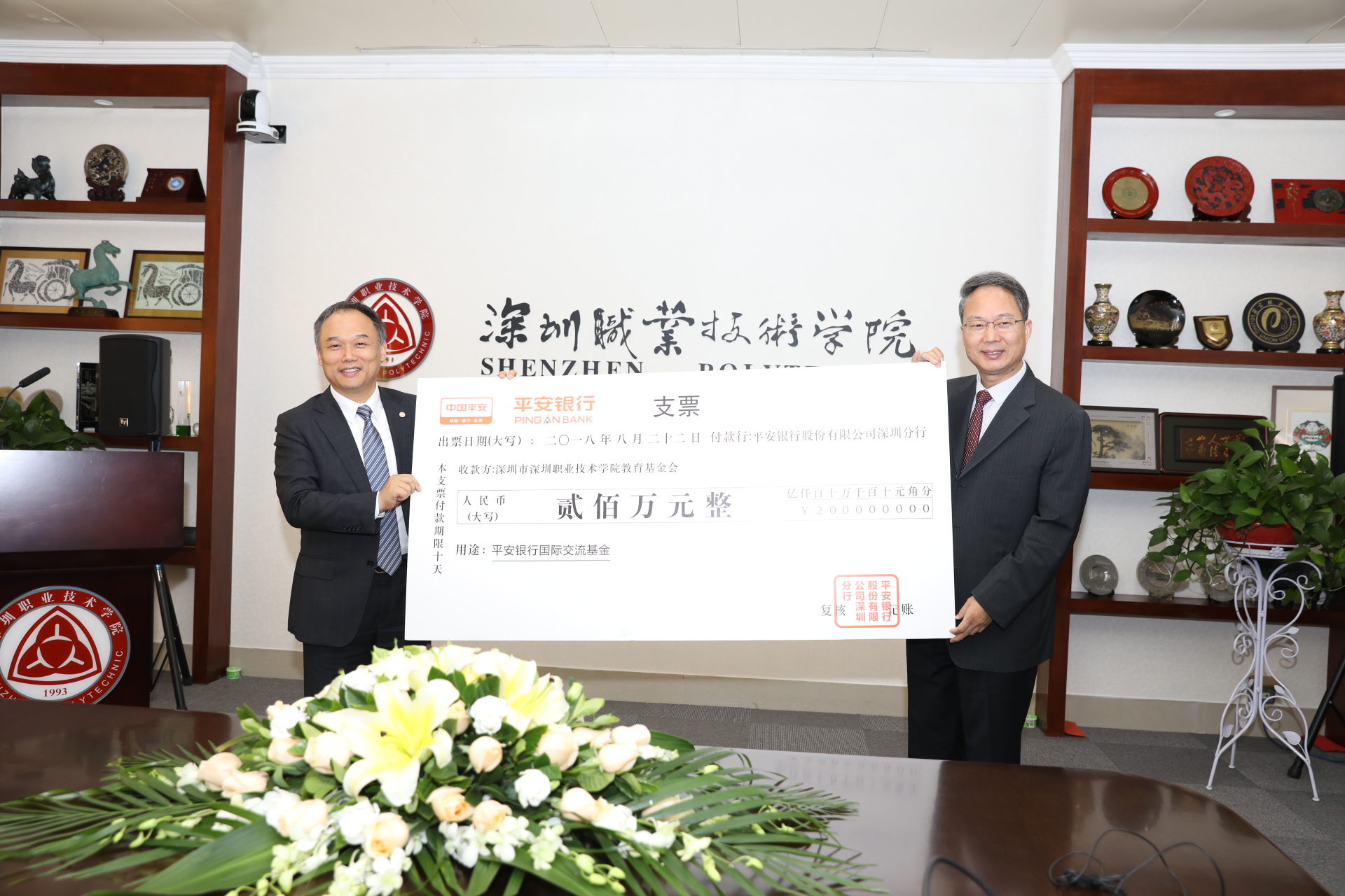 2018年11月22日,平安銀行與深圳職業(yè)技術(shù)學(xué)院校園一卡通項目交付儀式暨國際交流基金捐贈儀式在深圳職業(yè)技術(shù)學(xué)院101會議室隆重舉行。平安銀行行長助理、深圳分行楊志群行長、孫芳滔副行長、陳宏敬副行長、高寒竹零售總監(jiān),深圳職業(yè)技術(shù)學(xué)院陳秋明黨委書記、唐曉鳴副校長、董朝君副校長等領(lǐng)導(dǎo)出席了儀式。