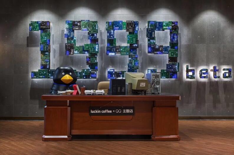瑞幸咖啡騰訊QQ主題店距離騰訊全球總部所在地濱海大廈不到兩公里。咖啡店充滿互聯(lián)網(wǎng)懷舊特色,擺放著騰訊20年前創(chuàng)業(yè)伊始的第一張辦公桌復(fù)刻版,懷舊打卡的立柱上裝飾有充滿時(shí)代特色的QQ聊天對(duì)話框,在這里還可以聽到復(fù)古的QQ提示音。1999年,QQ beta版(測試版)上線,歷經(jīng)多次迭代目前月活用戶達(dá)8億,成為全球最大的通訊社交平臺(tái)之一。