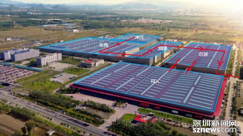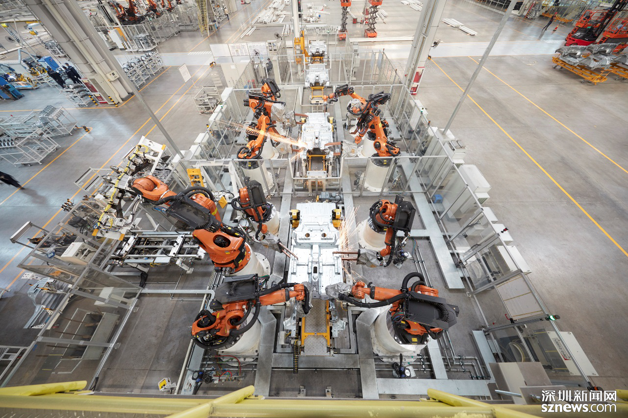 車身車間總占地面積9.9萬㎡,采用互聯(lián)機(jī)器人、柔性NC定位系統(tǒng)、柔性夾具切換系統(tǒng)、自動(dòng)化輸送系統(tǒng),標(biāo)準(zhǔn)化工藝體系、三層環(huán)網(wǎng)智能管理系統(tǒng)、國際安全標(biāo)準(zhǔn),主線自動(dòng)化率95%;采用柔性智能生產(chǎn)線,在同一條生產(chǎn)線可完成8個(gè)不同的車型無節(jié)拍損失自動(dòng)切換和混線生產(chǎn)。