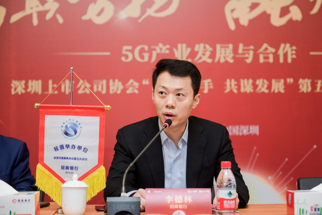 7月11日下午,由深圳上市公司協(xié)會(huì)牽頭、招商銀行股份有限公司主辦的“智聯(lián)萬(wàn)物,融智有招——5G產(chǎn)業(yè)發(fā)展與合作”會(huì)員月度圓桌會(huì)議第五次會(huì)議在招商銀行深圳分行大廈3樓多功能廳成功舉行。深圳市證監(jiān)局處長(zhǎng)梁文利、協(xié)會(huì)會(huì)長(zhǎng)麥伯良、協(xié)會(huì)執(zhí)行副會(huì)長(zhǎng)兼秘書長(zhǎng)黃鐵軍、招商銀行總行行長(zhǎng)助理李德林、總行董事會(huì)辦公室主任霍建軍等領(lǐng)導(dǎo)出席了本次活動(dòng),本次活動(dòng)邀請(qǐng)了來(lái)自信息技術(shù)、制造、金融、地產(chǎn)等5 G行業(yè)的40家上市公司董事長(zhǎng)、總經(jīng)理等60余人參加活動(dòng),行業(yè)專家齊聚一堂,共話5G發(fā)展浪潮中的機(jī)遇與挑戰(zhàn)。