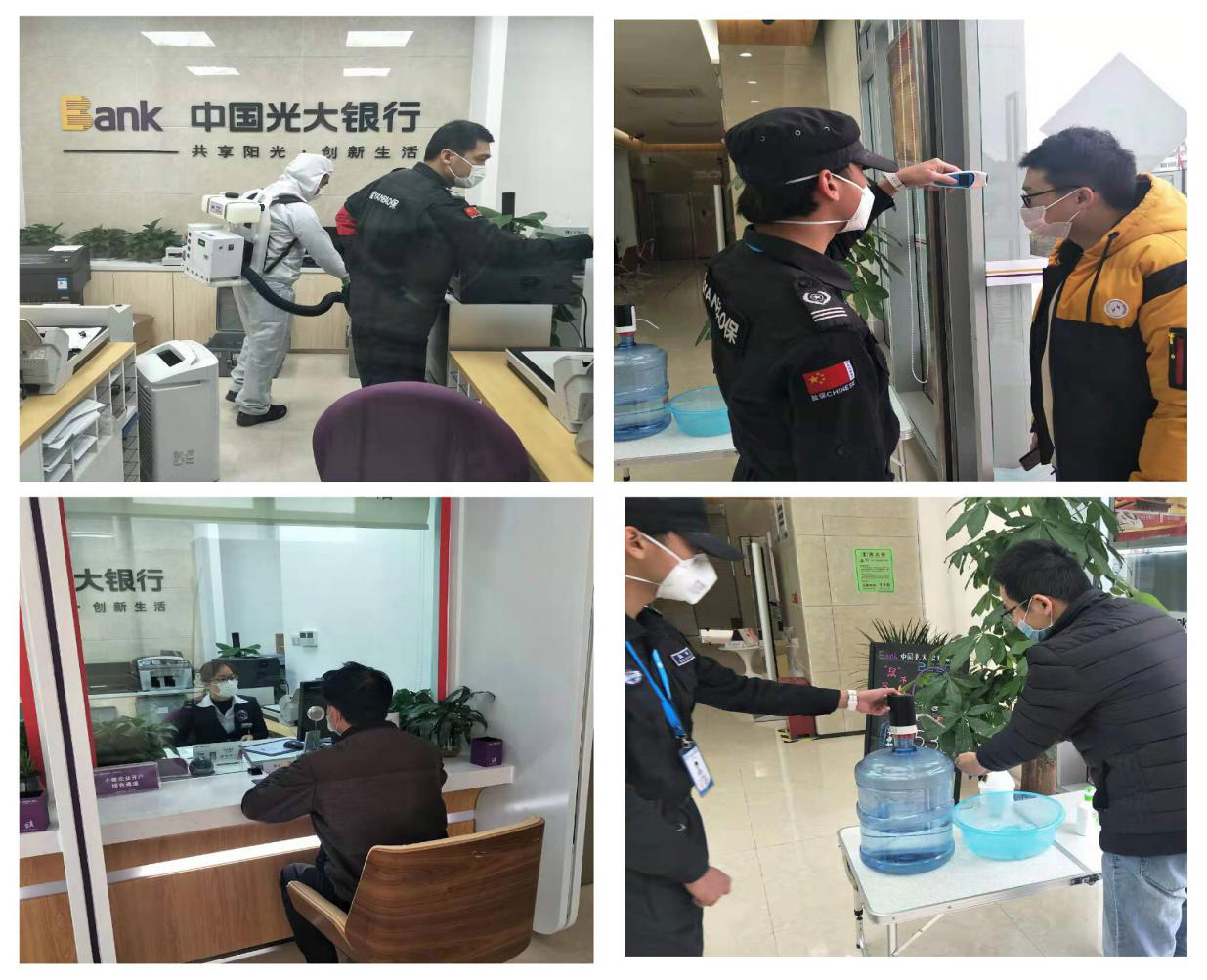 物資保障是防疫工作基礎(chǔ)性工作。復(fù)工之前,支行領(lǐng)導(dǎo)帶隊(duì)落實(shí)復(fù)工所需各項(xiàng)物資準(zhǔn)備情況,指定專人每天對(duì)網(wǎng)點(diǎn)進(jìn)行清潔與消毒,在所有客戶會(huì)觸摸到的公共區(qū)域貼上保鮮膜,每日三次消毒更換。要求全體上崗人員佩戴口罩、手套,做好自身防護(hù)。同時(shí),支行根據(jù)自身?xiàng)l件,在門口設(shè)置流動(dòng)水、洗手液、消毒液、紙巾、口罩回收簍等,在客戶進(jìn)入網(wǎng)點(diǎn)時(shí),要求必須佩戴口罩、測(cè)量體溫、進(jìn)行洗手登記,切實(shí)做好客戶安全防護(hù)。