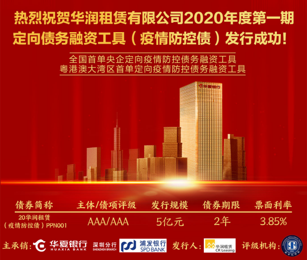 2月28日,由華夏銀行深圳分行主承銷的華潤(rùn)租賃有限公司2020年度第一期定向債務(wù)融資工具(疫情防控債)成功發(fā)行。