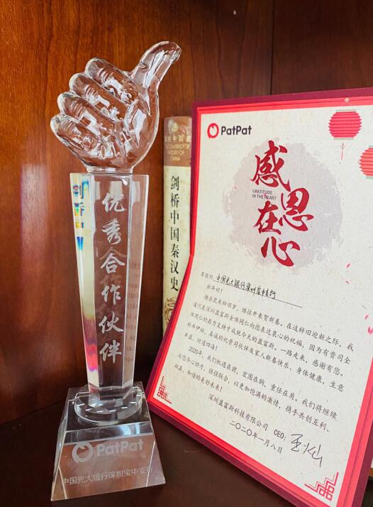 2020年新春伊始,光大銀行深圳寶中支行收到來自PATPAT平臺發(fā)來的感謝信,榮獲PATPAT平臺頒發(fā)的“優(yōu)秀合作伙伴”獎(jiǎng)。