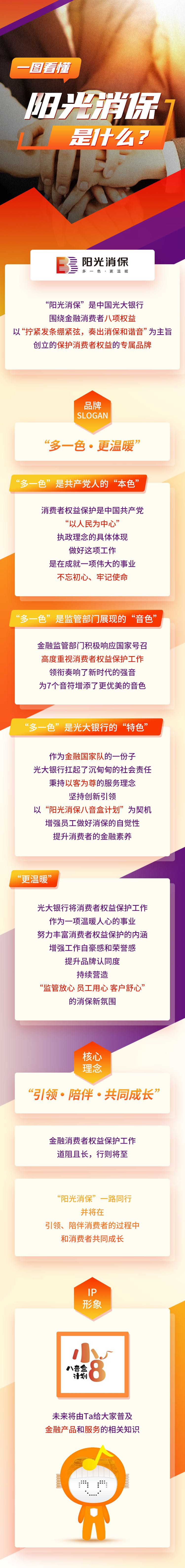 中國光大銀行“陽光消保”品牌標(biāo)識(shí),貫徹了“一個(gè)光大”的品牌管理原則,突出了金融消費(fèi)者權(quán)益保護(hù)與銀行現(xiàn)有業(yè)務(wù)的依存及拓展關(guān)系,在全面貫通現(xiàn)有服務(wù)基礎(chǔ)上,針對金融消費(fèi)者權(quán)益的“八項(xiàng)基本權(quán)益”,向全社會(huì)做出了“引領(lǐng)·陪伴·共同成長”的莊嚴(yán)承諾。