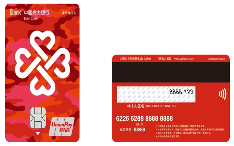 在金融服務(wù)產(chǎn)品方面,光大銀行面向軍人、退役軍人發(fā)行“擁軍優(yōu)撫”專屬聯(lián)名卡,優(yōu)撫對(duì)象可以憑軍官證、士兵證、退役證等有效證件在該行營(yíng)業(yè)網(wǎng)點(diǎn)柜臺(tái)辦理賬戶開立并免收卡片工本費(fèi),“擁軍優(yōu)撫”專屬銀行卡在全國(guó)統(tǒng)一實(shí)現(xiàn)兩個(gè)專屬服務(wù)和十項(xiàng)優(yōu)惠政策。