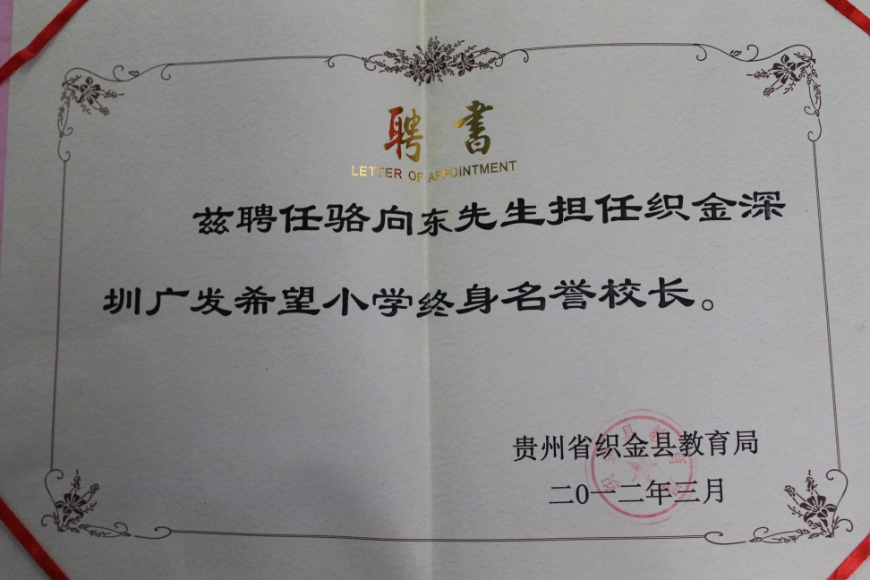 2013年,在駱向東的退休儀式上,織金縣教育局將一張希望小學(xué)終身名譽(yù)校長(zhǎng)的聘書,鄭重交到了他的手上?!拔液軜s幸能代表廣發(fā)銀行深圳分行黨委去推動(dòng)這件事,但公益事業(yè)任重道遠(yuǎn),我相信愛心基因會(huì)在廣發(fā)一直傳承下去?!笔聦?shí)也正如駱向東所言,從1998年籌建希望小學(xué)至今,一代代廣發(fā)人身體力行,讓愛心助學(xué)一棒接力一棒。