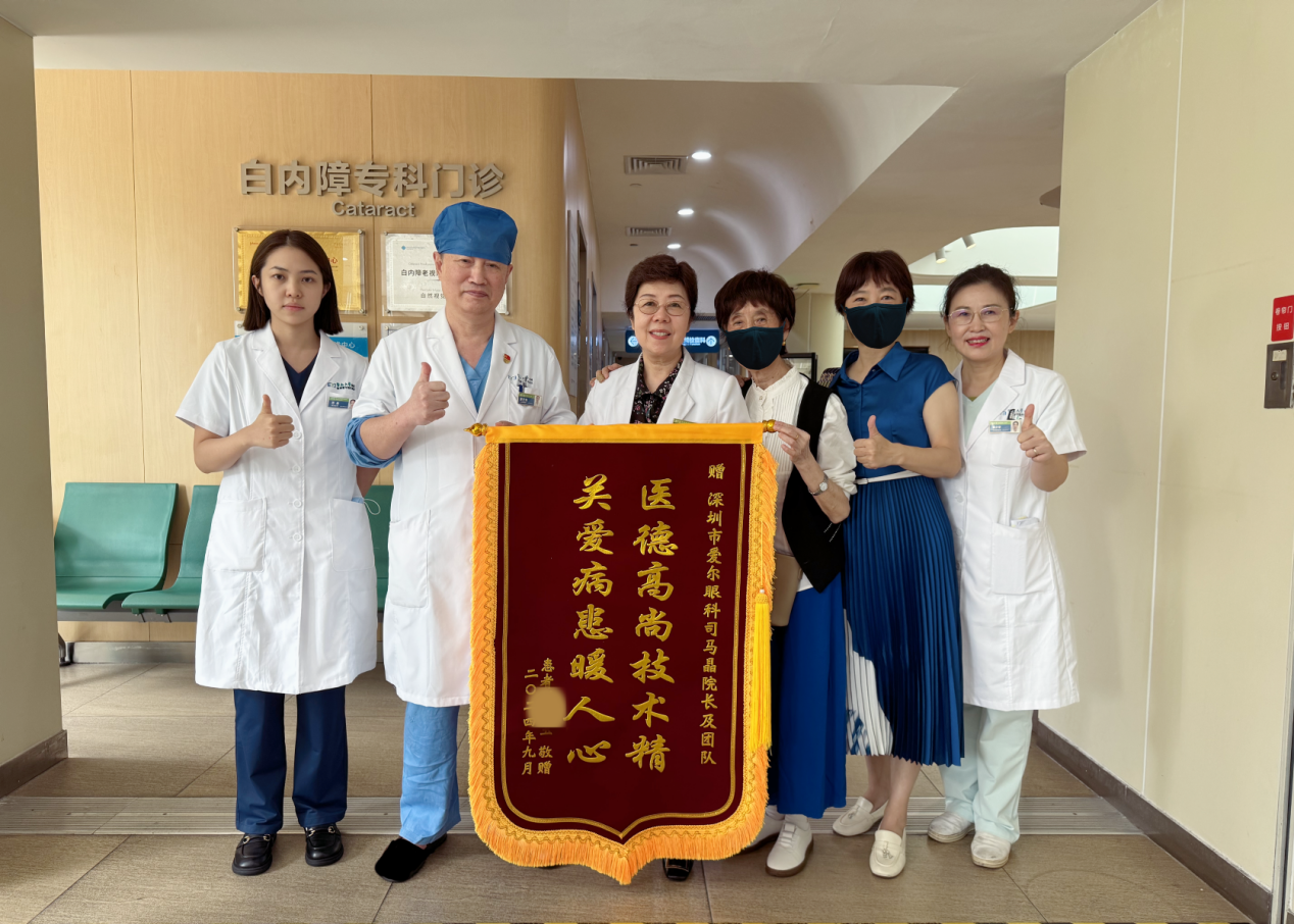 完成手術(shù)的劉奶奶心情無比輕松,坐在輪椅上被推出手術(shù)室時,她向醫(yī)護(hù)人員豎起了大拇指。兩天后,劉奶奶又順利進(jìn)行了另一只眼的手術(shù)。通過飛秒激光輔助白內(nèi)障手術(shù),一次性解決了她的白內(nèi)障、遠(yuǎn)視、散光及老視等多種眼病困擾。術(shù)后,她為醫(yī)護(hù)人員送來錦旗,激動地抱著司馬晶教授道謝:“感謝您治好了我的眼睛,我現(xiàn)在看遠(yuǎn)看近都很清楚,真后悔沒有早點做這個手術(shù)!”