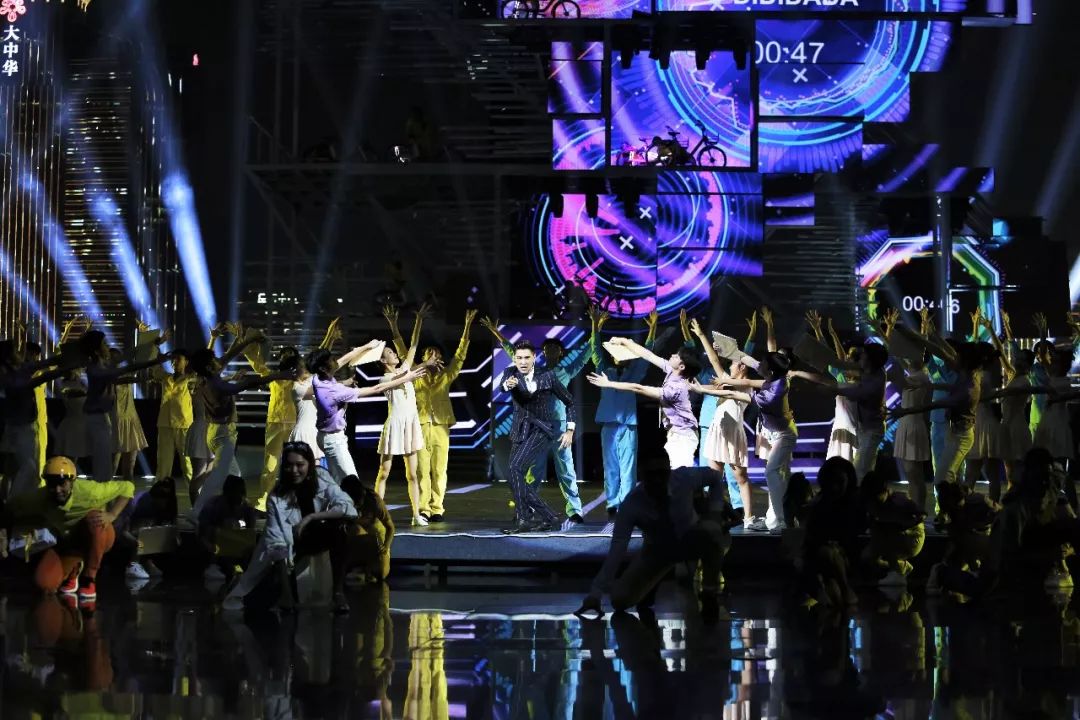 在本場晚會上,為了響應“追夢”主題,李盾聯(lián)合百 老匯頂級音樂劇導演卓依·馬可尼利、國際著名作曲家阿鯤,著名作詞家梁芒為晚會創(chuàng)作了一段音樂劇形式的節(jié)目《嘀嘀嗒嗒》。作為節(jié)目的重心,主創(chuàng)團隊在劇中融入了原創(chuàng)音樂劇《深南大道》的主題曲《新的一天》選段。內(nèi)容以深圳每一個上班族的工作和生活作為出發(fā)點,以音樂劇的形式設計了如秘書、創(chuàng)業(yè)者、設計師、程序員、義工和銷售等等不同的角色,年輕的演員、動聽的旋律、跌宕的劇情、新穎的節(jié)奏,點燃了現(xiàn)場觀眾的熱情。精彩的表演配合晚會場地絢爛激情的燈光秀,以及舞臺中心十多米高被命名為“追夢人”的LED裝置,不時更換相應的場景多媒體,整體形成如夢幻般的光影效果。