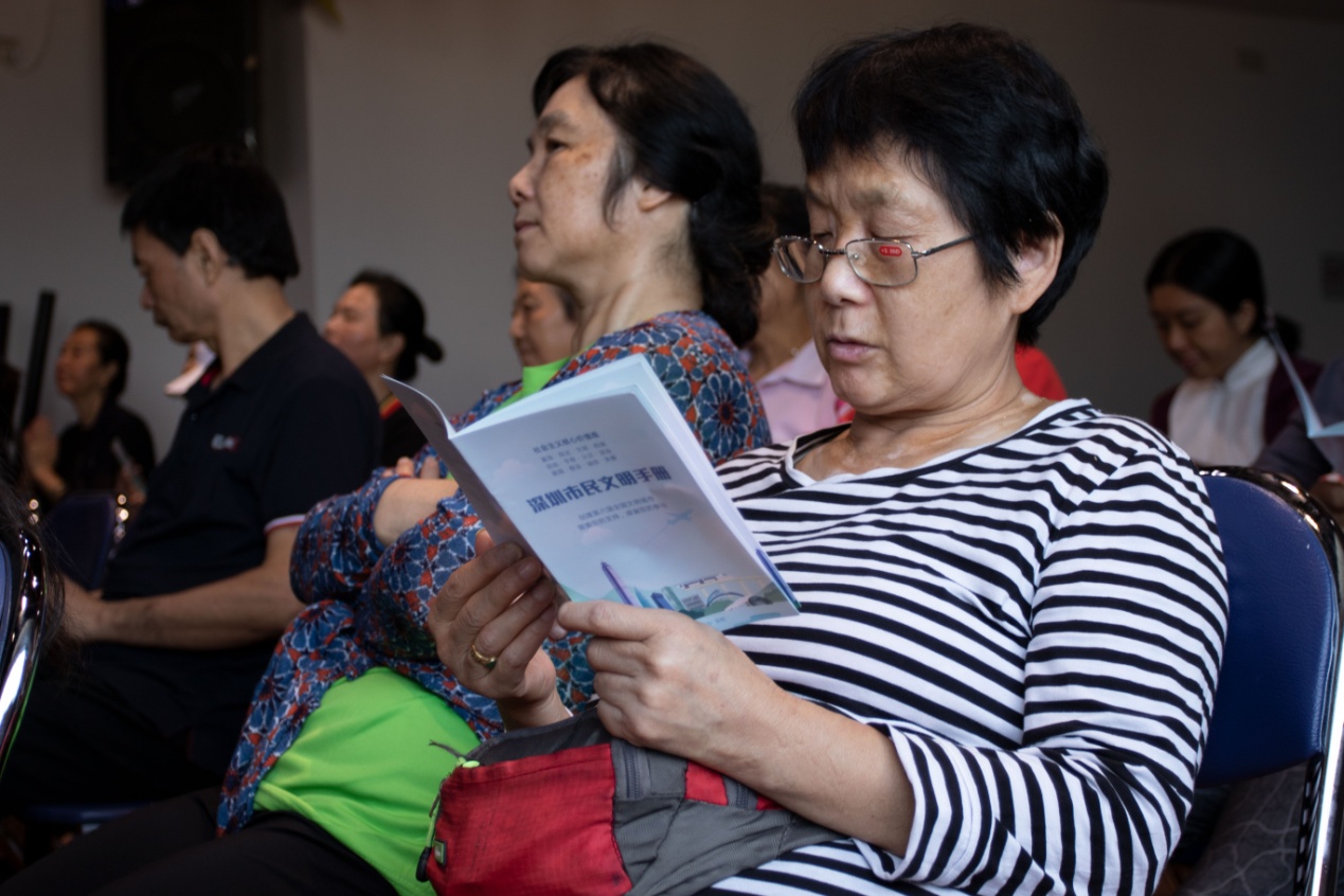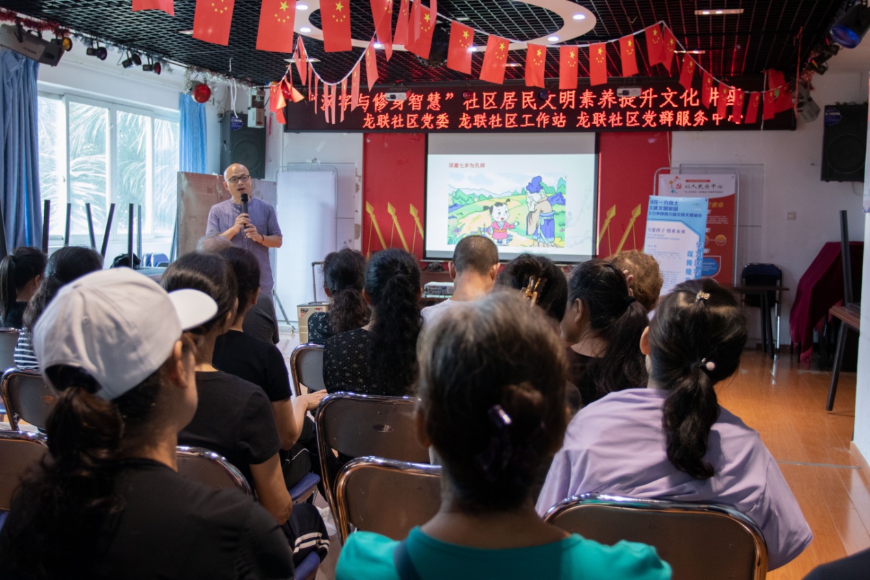 11月13日上午,本系列活動(dòng)的第六場(chǎng)講座在龍聯(lián)社區(qū)工作站拉開了序幕。講座開始前,現(xiàn)場(chǎng)聽眾每人手上都拿到一本《深圳市民公約》小手冊(cè)和《漢字與修身智慧》學(xué)習(xí)資料,劉建彪老師首先跟大家互動(dòng):“我們需要什么樣的家園?文明城市從哪里開始?”“美麗、溫馨、文明、和諧的家園”,臺(tái)下一位叔叔的聲音尤其洪亮,劉老師及時(shí)肯定了他的回答。劉老師接著說,文明城市從人開始,人是建設(shè)文明城市的中堅(jiān)力量,他進(jìn)一步補(bǔ)充道,做文明人的第一步是轉(zhuǎn)變思想,只有了解并認(rèn)同文明的重要性,才會(huì)自覺地踐行文明禮儀,積極參與城市文明的創(chuàng)建。