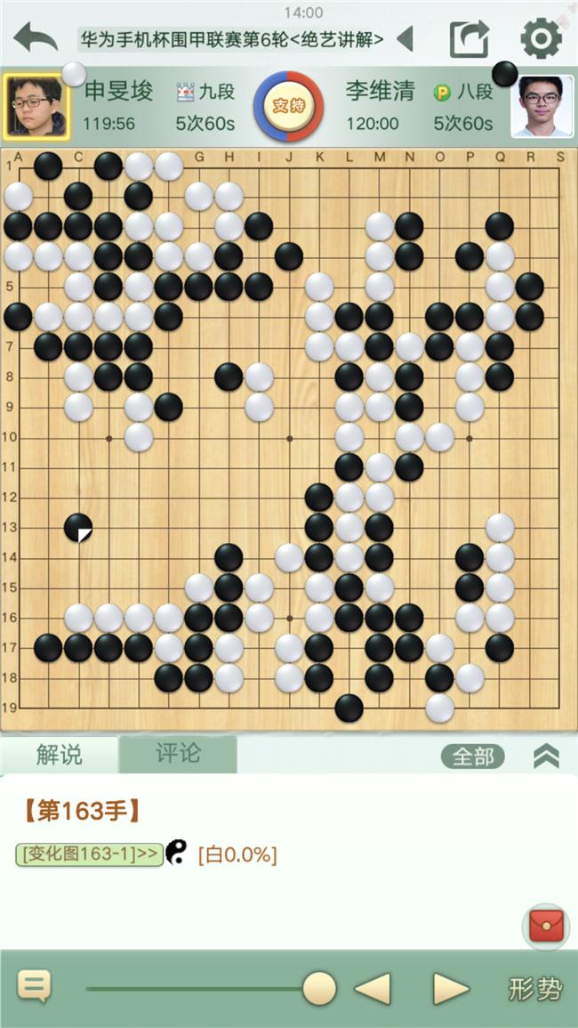 第二臺,申旻俊主將對陣李維清。右上作戰(zhàn)黑棋下出了一子解雙征的妙手,白棋應對失誤大虧損。