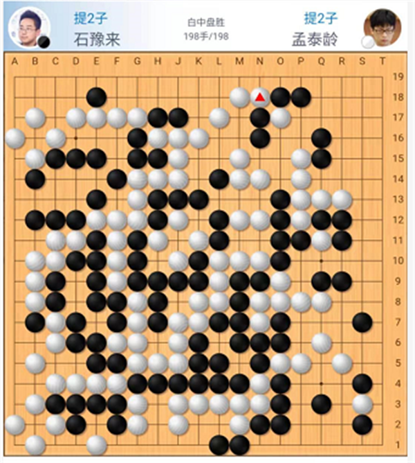 主將臺由深圳隊世界冠軍時越九段執(zhí)白對陣小將王世一五段。中盤戰(zhàn)斗中黑棋連續(xù)下出緩手,白棋取得領(lǐng)先。中央定型白棋又出現(xiàn)小失誤,局面接近。官子階段雙方錯進錯出,局面一度來回波動。最終還是白棋后半盤功力略勝一籌,獲得些許便宜后以明顯優(yōu)勢獲勝,時越執(zhí)白中盤勝王世一。