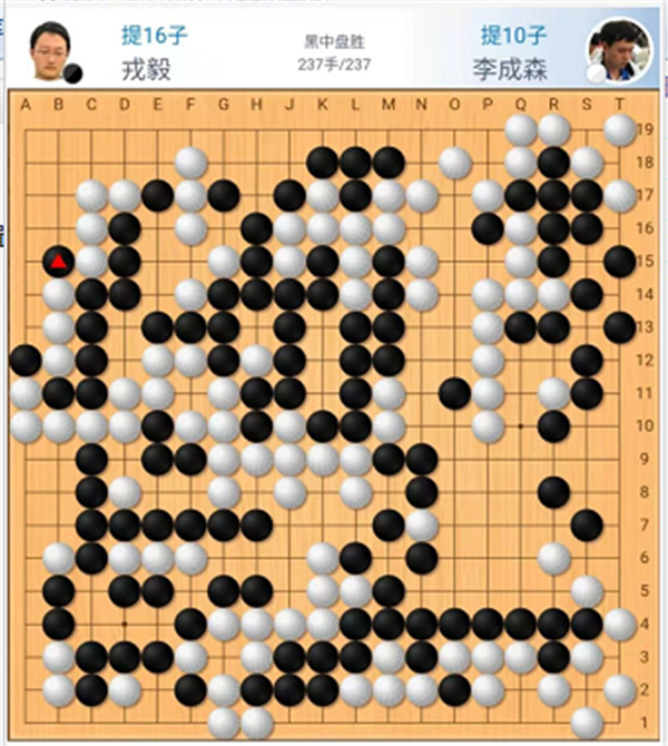 快棋臺由深圳隊的戎毅七段執(zhí)黑對陣天津隊的李成森五段。序盤平穩(wěn)過渡,進入中盤時黑棋在白上方大空中試應(yīng)手,白棋最大程度強撐大空,留下隱患。在下方定型結(jié)束后,黑棋在白空中弈出巧手將白空打穿,取得領(lǐng)先。在劣勢情況下,白棋在爭搶官子時置中央大龍于不顧,黑棋攻殺白大龍順勢將白棋左下角吃掉,一舉獲勝。戎毅執(zhí)黑中盤勝李成森。