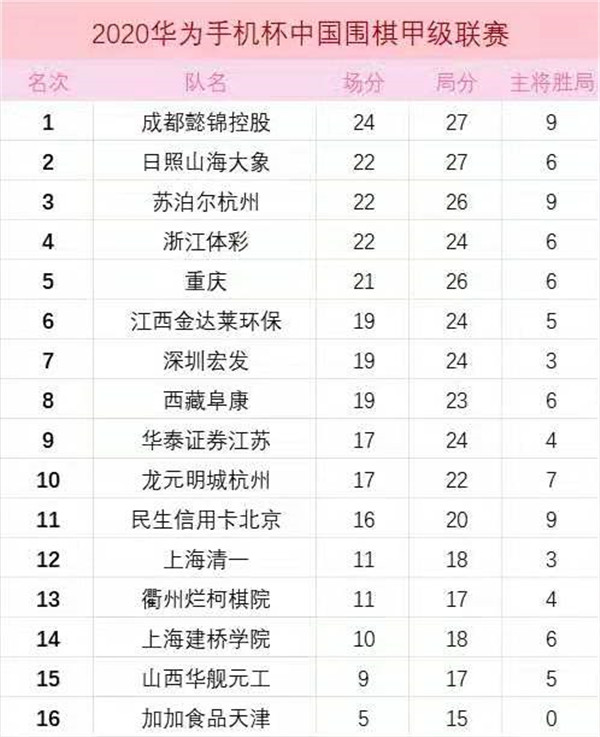 本輪深圳宏發(fā)隊3:1勝加加食品天津隊全取三分,目前積19分,暫列第七。本輪其它隊賽果如下:龍元明城杭州隊 2:2 重慶隊,上海建橋?qū)W院隊 1:3 成都懿錦控股隊,華泰證券江蘇隊 3:1 江西金達萊環(huán)保隊,日照山海大象隊 3:1 衢州爛柯棋院隊,西藏阜康 3:1 上海清一,浙江體彩隊 3:1 民生信用卡北京隊,蘇泊爾杭州隊 2:2 山西華艦元工隊。