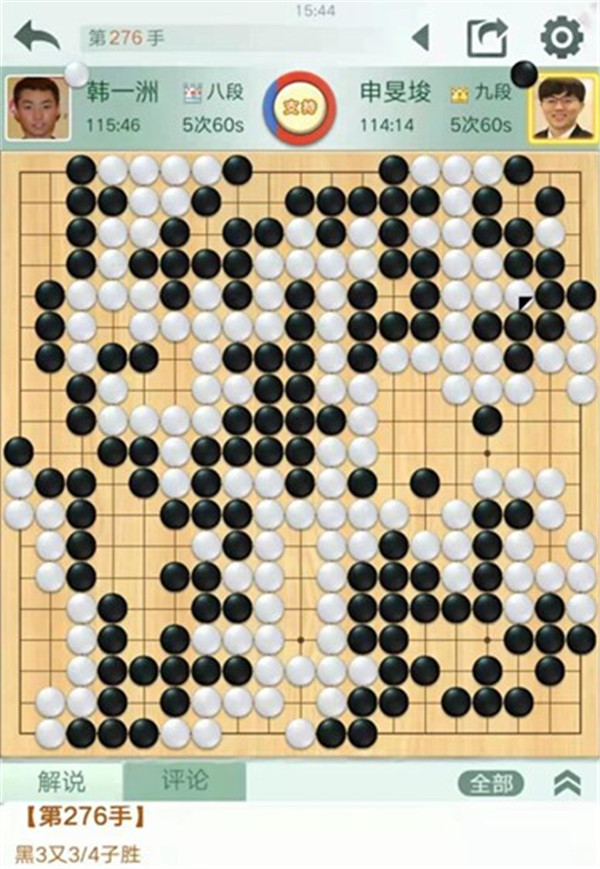 申旻俊主將執(zhí)黑對(duì)陣小將韓一洲,布局局面接近。進(jìn)入中后盤后,白方明顯功力不足,小失誤不斷。黑棋優(yōu)勢逐漸擴(kuò)大,最終以較大差距獲勝。