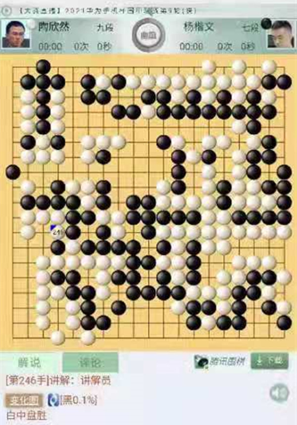 三臺陶欣然執(zhí)白對陣等級分排名29位的楊楷文。開局右邊黑棋沖擊白棋將白分斷,但是由于棋形沒有下對,反而用來斷開白棋的棋筋被吃,白棋早早進入勝勢。這一盤是此輪深圳龍華隊唯一勝局,不易!為陶欣然點贊!