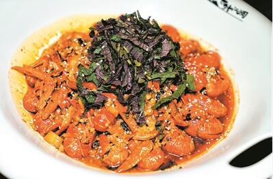 廚師用了特別從湖南長(zhǎng)沙選來的紫蘇,在碗底鋪上一層,再將炒制過的小龍蝦放上,最后于蝦面上多撒一層紫蘇,吃時(shí)拌起,紫蘇的香氣充分融入蝦身,風(fēng)味獨(dú)特。