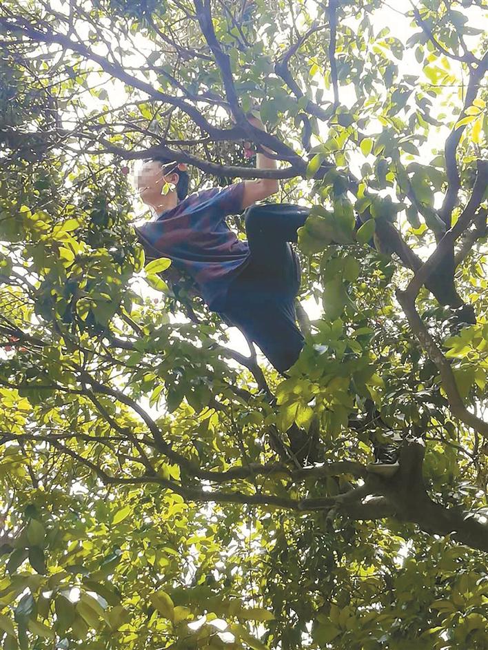 在荔枝公園,游人不顧危險爬樹采摘荔枝。