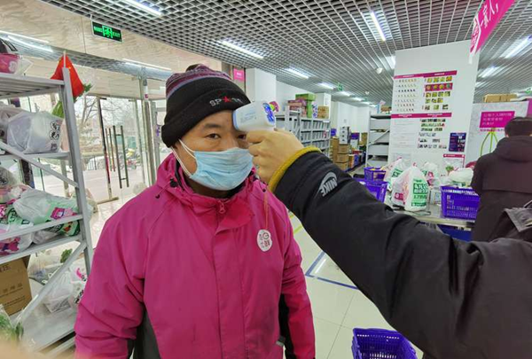 每日優(yōu)鮮工作人員為配送員測(cè)量體溫