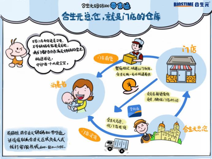 顧客因道路封閉等原因在老家,需要奶粉,和原來(lái)常住地的母嬰門店老板下單。如果原來(lái)母嬰門店無(wú)法寄送產(chǎn)品到異地的消費(fèi)者,母嬰門店老板把需求報(bào)給合生元媽媽100零售通,合生元從自己的總倉(cāng)出貨快遞,利潤(rùn)還計(jì)入原來(lái)門店的賬上。