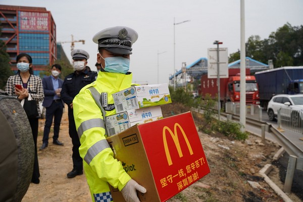 你們在一線戰(zhàn)疫,我們來為你補給!隨后,市關愛辦攜手伊利集團、麥當勞先后前往光明羌下公安檢查站、寶安區(qū)松安防疫檢查點,為正在一線忙碌的工作人員,送上愛心牛奶與熱乎乎的愛心午餐?!澳銈冃量嗔恕薄ⅰ袄^續(xù)加油”……每發(fā)放一次牛奶與午餐,工作人員都不忘了戰(zhàn)疫者們致敬致謝。
