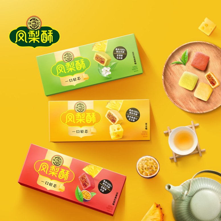 在新品一口酥推出的同時(shí),徐福記亦對(duì)經(jīng)典鳳梨酥進(jìn)行一次全面的升級(jí)。優(yōu)質(zhì)的產(chǎn)品離不開(kāi)好的原料配方,相比原來(lái)的產(chǎn)品,內(nèi)餡含量提升至少10%,鳳梨酥的鳳梨果肉含量更是達(dá)到22%,更濃郁的水果風(fēng)味,含有膳食纖維,搭配奶香四溢的酥松外皮,一口滿足。在口感上,改掉外皮掉渣,細(xì)屑滿地,降低內(nèi)餡甜度,更符合當(dāng)下消費(fèi)者的健康需求。不僅好吃,包裝的顏值也進(jìn)行了升級(jí),簡(jiǎn)約時(shí)尚的設(shè)計(jì),以滿滿果芯增添食欲感。