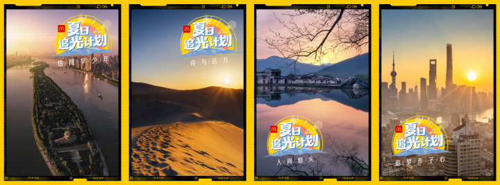 7月6日,麥當(dāng)勞“夏日追光計(jì)劃”從西安大雁塔出發(fā),來到長(zhǎng)沙橘子洲頭,領(lǐng)略“恰同學(xué)少年”的意氣風(fēng)發(fā)。從敦煌、漠河,到青海湖和張掖,一起尋找“詩(shī)與遠(yuǎn)方”??缭角鄭u、杭州、福州、大連、蘇州和平遙,看遍“人間煙火”。在廣州小蠻腰和深圳東門,感受“追夢(mèng)赤子心”。為期28天的追光之旅,暖心浪漫的麥當(dāng)勞為大家搜集不同城市的日出,并用四個(gè)主題串起28地。敬請(qǐng)關(guān)注麥當(dāng)勞嗶哩嗶哩(B站)帳號(hào),鎖定連續(xù)28天的直播,也可以訪問麥當(dāng)勞官方網(wǎng)站觀看每天日出的精華視頻。