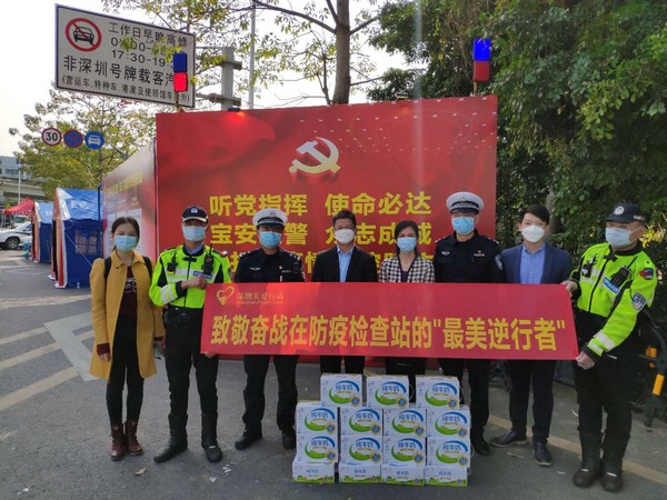 在深圳,2020年2月伊利攜手深圳市關(guān)愛(ài)辦及深圳新聞網(wǎng)發(fā)起“致敬‘最美逆行者’”活動(dòng),向深圳戰(zhàn)疫一線的民警、交警、醫(yī)務(wù)工作者、義工等進(jìn)行慰問(wèn)和捐贈(zèng),先后前往光明區(qū)光明交警大隊(duì)、光明羌下公安檢查站、寶安區(qū)松安防疫檢查點(diǎn),為戰(zhàn)疫在一線的工作人員送上愛(ài)心牛奶與溫暖午餐。