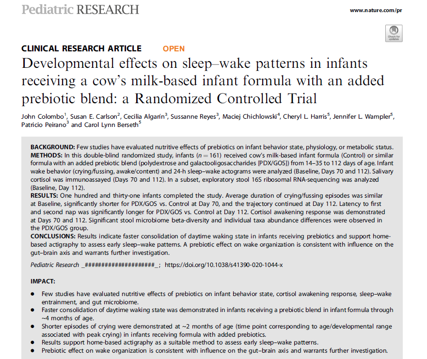 近日,一篇臨床研究揭示了寶寶腸道營養(yǎng)與睡眠間的關(guān)聯(lián)。據(jù)悉,這項研究于2014年啟動,是全球首個探究 PDX+GOS益生元組合配方奶粉與寶寶睡眠模式養(yǎng)成關(guān)系的雙盲隨機對照試驗。研究由美國堪薩斯大學(xué)壽命研究所John Colombo教授牽頭,美國堪薩斯大學(xué)醫(yī)學(xué)中心營養(yǎng)學(xué)系、智利大學(xué)營養(yǎng)與食品技術(shù)研究所睡眠與功能性神經(jīng)生物學(xué)實驗室等多個國際知名研究機構(gòu)共同參與。這項研究在經(jīng)研究同行的層層學(xué)術(shù)審評后,近日于《兒科研究》上正式發(fā)表,成果獲得科學(xué)界認(rèn)可。