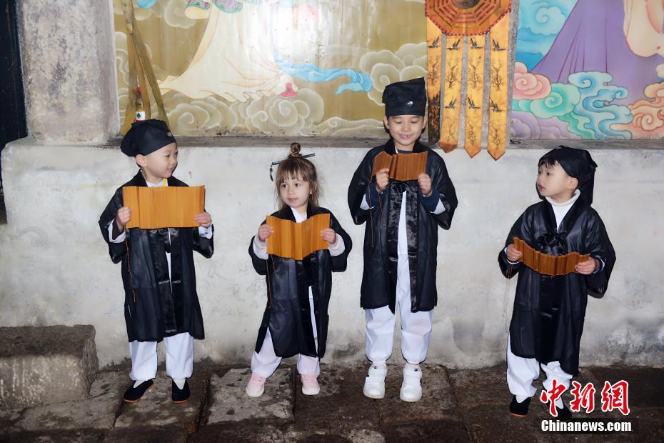 10月16日,在“道教名山”、世界自然遺產(chǎn)地江西上饒三清山,5名來自中外的萌娃身穿統(tǒng)一道服,手持竹簡(jiǎn),在三清宮跟著道教師傅朗讀《道德經(jīng)》、《弟子規(guī)》,學(xué)習(xí)太極拳、書法、古箏等中國(guó)傳統(tǒng)文化。這群萌娃中年齡最小的僅11個(gè)月,年齡最大也只有6歲。程希雪攝