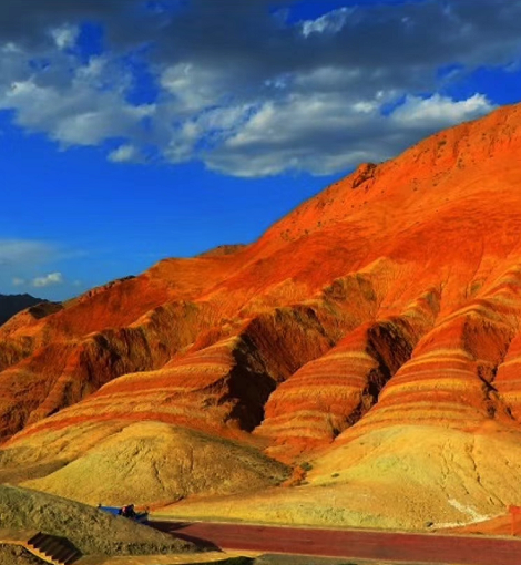 夜宿張掖丹霞公園,早晚之景,分外別致,既有朝陽(yáng)晚霞的映襯,也有山貌土質(zhì)的特性,構(gòu)筑成一幅幅天地合一的壯麗畫(huà)面,于是,我又寫(xiě)下來(lái)“猜2”——-丹陽(yáng)裸照山土紅,晚霞斜映溝丘重,七色帶環(huán)競(jìng)爭(zhēng)艷,彩云作被情更濃!此又何處?