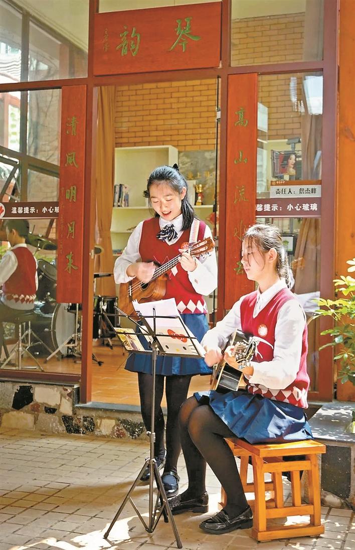 校園一角的“樂·舞臺”上擺放著一架鋼琴,陳鐵成校長說:“在沒有疫情的時候,這架鋼琴是不上鎖的,任何老師或?qū)W生都可以彈奏。同樣開放的還有琴韻閣、清心閣,不要擔(dān)心學(xué)生會破壞這些東西,美自然地呈現(xiàn)在學(xué)生們面前,自然地發(fā)生,真正的教育就是在這樣的情境中發(fā)生的?!?/p>