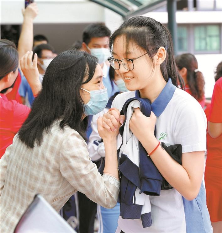 “你們今天的狀態(tài)看起來都特別好,很精神。”在羅湖高級中學(xué)考點(diǎn),高三送考老師一邊擁抱候考的學(xué)生一邊微笑著說,“準(zhǔn)考證拿好,別緊張,輕松應(yīng)考!”考點(diǎn)外,老師們身著紅色“送考服”為學(xué)生打氣,老師們表示,“希望考生金榜題名,馬到成功!做的都對,考的都會!”
