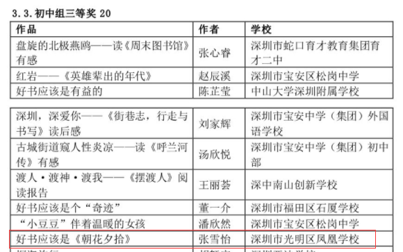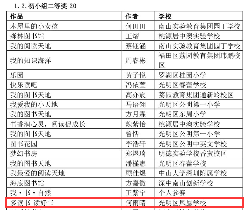 在深圳市4·23世界讀書(shū)日“探索閱讀新領(lǐng)域”創(chuàng)作比賽中學(xué)校榮獲優(yōu)秀組織獎(jiǎng),何雨晴、劉宥伯同學(xué)分別獲初小組二等獎(jiǎng)、三等獎(jiǎng);阮澤宇、張雪怡同學(xué)分別榮獲初中組二等獎(jiǎng)、三等獎(jiǎng)。郭瑞芳老師榮獲優(yōu)秀指導(dǎo)老師獎(jiǎng),曾嵽稜、賴(lài)美君、李海亮榮獲優(yōu)秀組織老師獎(jiǎng)。