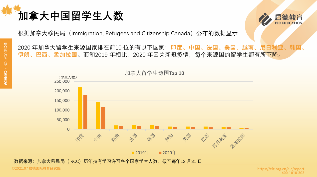 另一組數(shù)據(jù)顯示,2020年中國內(nèi)地學(xué)生新增人數(shù)最多的三個省為安大略省(49.78% )、英屬哥倫比亞省(26.17% )、魁北克?。?.49% )。一方面,安大略省與英屬哥倫比亞省這兩個省份的教育資源非常豐富,有多所世界知名大學(xué)讓中國學(xué)生選擇;另一方面,多倫多、溫哥華、渥太華等大城市均在這兩個省份,工作機會多,移民政策也相對成熟,對希望留在加拿大發(fā)展的留學(xué)生很具吸引力。