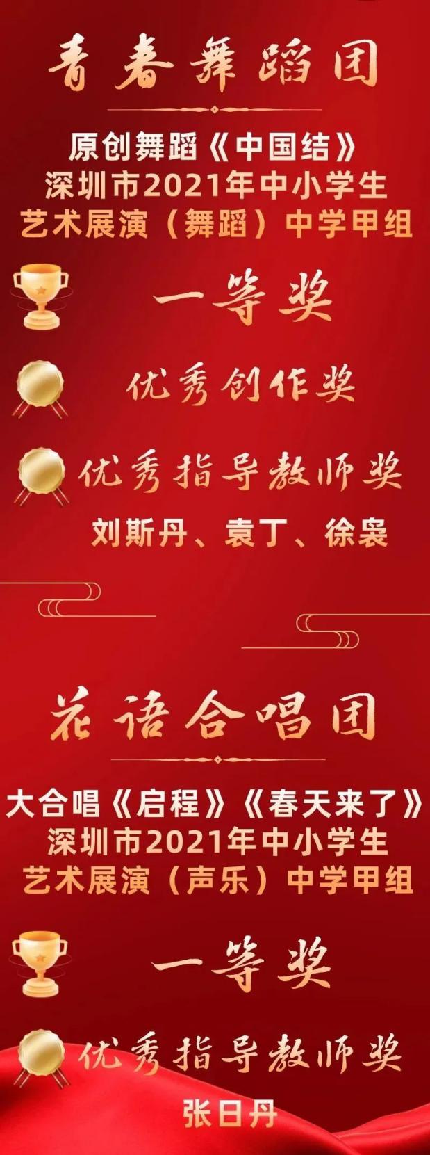 二實(shí)青春舞蹈團(tuán)以原創(chuàng)作品《中國(guó)結(jié)》在全市各區(qū)以及市直屬學(xué)校選拔出來(lái)的37個(gè)節(jié)目中脫穎而出,獲得全場(chǎng)最高分!接下來(lái),青春舞蹈團(tuán)將代表深圳市參加省賽,有望沖擊全國(guó)決賽!此外,二實(shí)花語(yǔ)合唱團(tuán)也憑借大合唱《啟程》《春天來(lái)了》榮獲深圳市2021年中小學(xué)藝術(shù)展演(聲樂(lè))中學(xué)甲組一等獎(jiǎng)。劉斯丹、袁丁、徐裊、張日丹等老師榮獲優(yōu)秀指導(dǎo)老師獎(jiǎng)。
