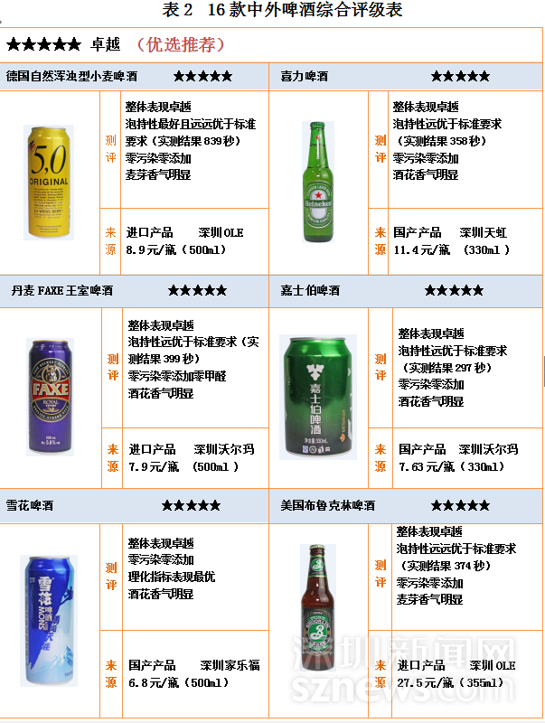 16款中外啤酒中,6款評級五星,國產(chǎn)與進口各3款,分別為:德國自然渾濁型小麥啤酒 、喜力啤酒 、丹麥FAXE王室啤酒 、嘉士伯啤酒、 雪花啤酒、美國布魯克林啤酒。獲得四星評級的有6款,國產(chǎn)5款進口1款,4款三星評級均為進口啤酒。另外,16款中外啤酒均未出現(xiàn)違規(guī)使用添加劑和污染物超標情況,均符合國家食品安全標準,甲醛含量均優(yōu)于國標要求。