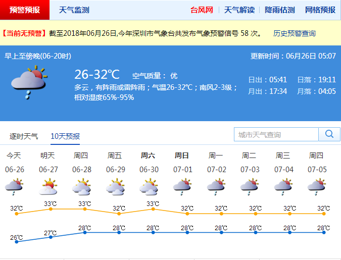 深圳新聞網(wǎng)6月26日訊(記者 何暢)昨天夜間到今天白天,深圳陰天轉(zhuǎn)多云,有陣雨和雷陣雨,最大雨量出現(xiàn)在草埔站,為44.2毫米,早晨最低氣溫在25-26℃,白天最高氣溫在30-31℃;偏南風(fēng)2-3級(jí);相對(duì)濕度70%-95%;全市能見度普遍在10-15公里,雨時(shí)能見度有所降低。