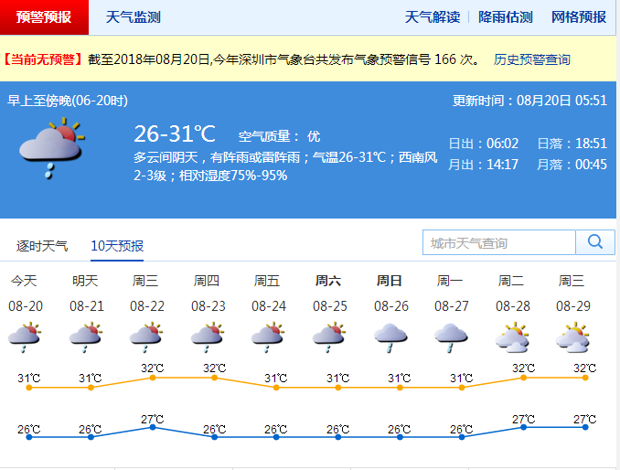 深圳新聞網(wǎng)訊 鵬城昨日又出現(xiàn)局地雷雨,氣溫居高不下,最高氣溫普遍在31℃左右。市氣象臺預測,未來一周,深圳維持炎熱天氣,仍有局地陣雨,市民應注意采取防范措施。
